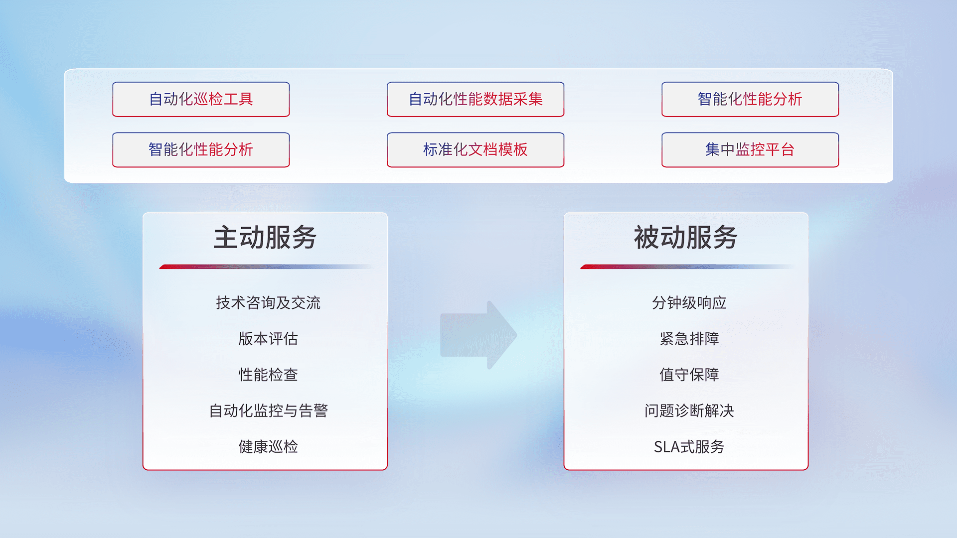 智能化工具和标准化文档,,,保障服务质量,,,,提供主动服务(包含技术咨询、、、、版本评估、、、、性能检查、、、、自动化监控与告警、、、健康巡检)和被动服务包含(分钟级响应、、、紧急排障、、、值守保障、、、问题诊断解决、、、SLA服务)。。。。