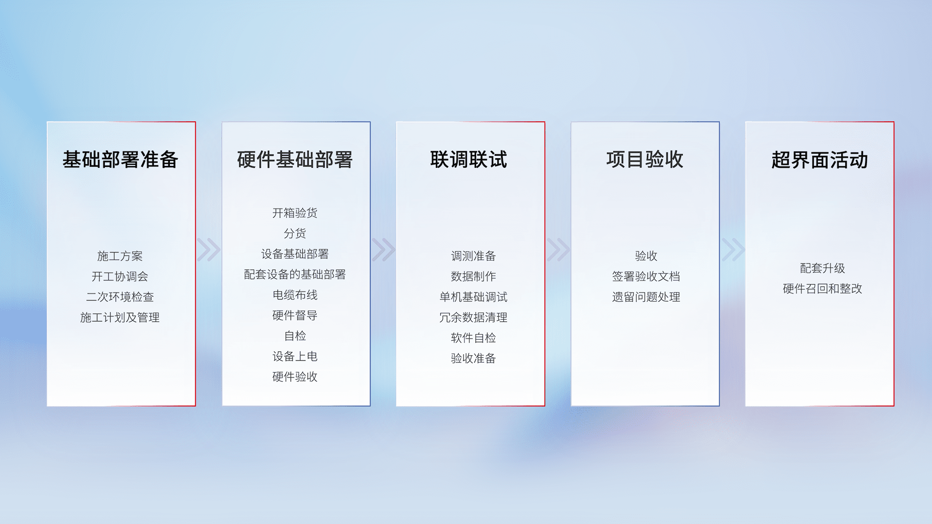 从基础部署准备、、、、硬件基础部署、、、、联调联试、、项目验收、、、越界面活动的全过程可追溯,,,,保证施工质量和进度。。。。